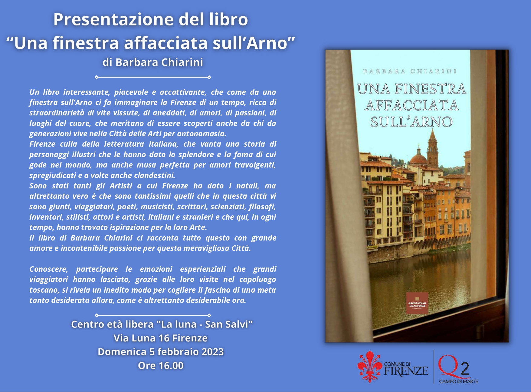 Domenica 5 Febbraio alle ore 16.00, presso il Centro Età Libera "La Luna-San Salvi" in Via Luna n.16, si terrà la presentazione del libro "Una finestra affacciata sull'Arno", di Barbara Chiarini.