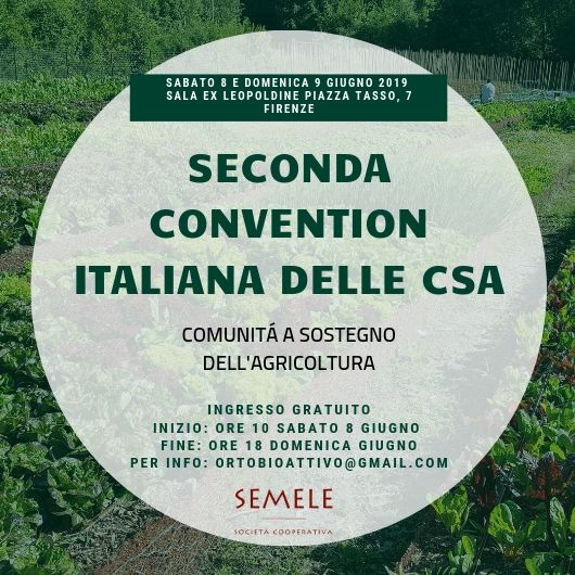 A Firenze due anni fa è nata Semele, la prima CSA della Toscana. A cura di Semele è l’evento organizzato presso la sala Ex Leopoldine i giorni 8 e 9 giugno, allo scopo di aprire la strada ad un percorso di confronto e scambio di esperienze tra persone che credono nel modello rappresentato da CSA. Gli incontri, gratuiti e aperti a tutti, dando priorità alle aziende agricole e cooperative già attive sul territorio o in fase di costituzione, saranno costituiti da momenti di confronti in sessioni plenarie e successivi tavoli di lavoro specifici.