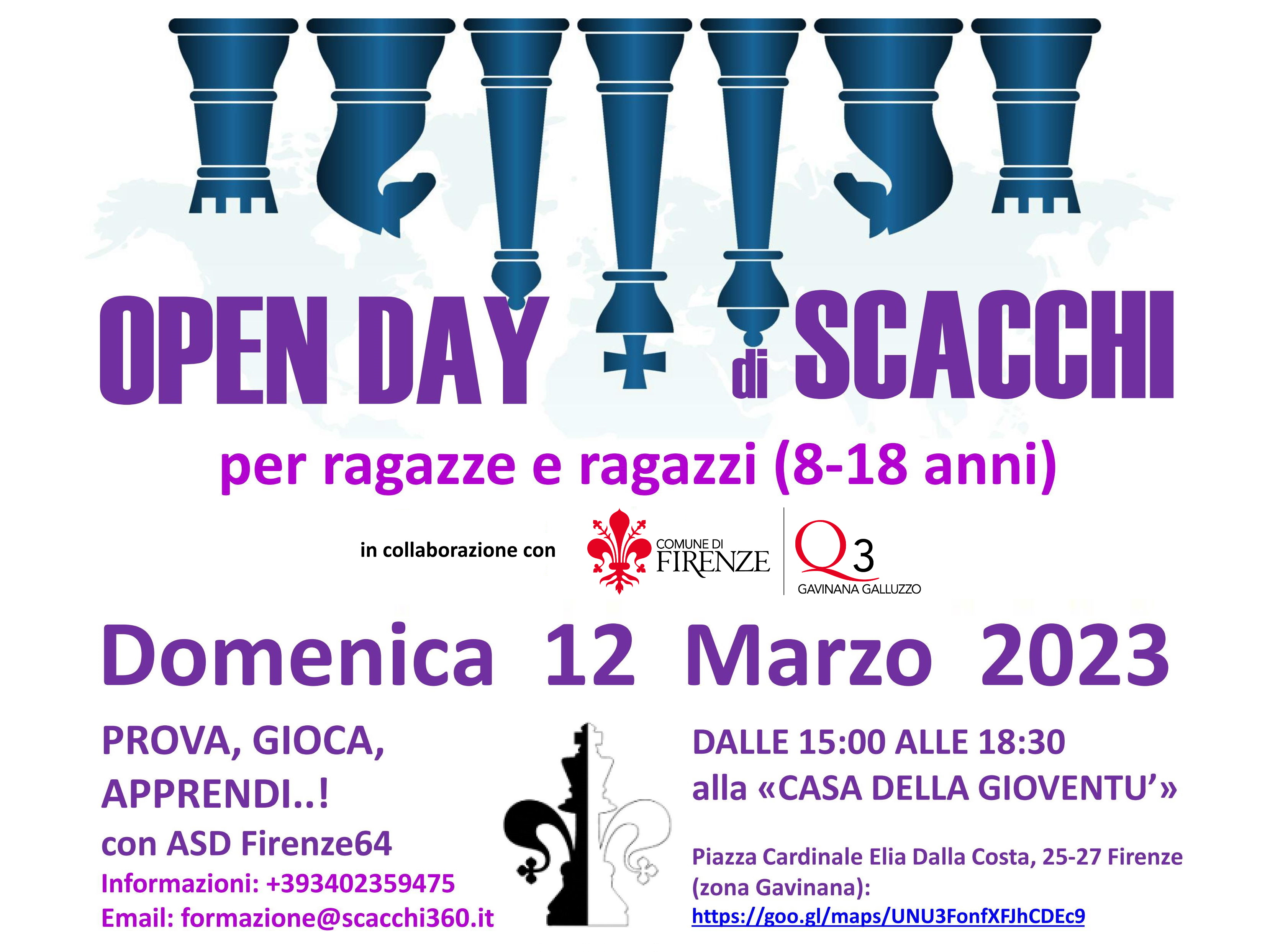 L’open day consiste in un pomeriggio di presentazione del gioco degli scacchi da parte dell' ASD Firenze64: l'offerta è rivolta rivolta a bambini e ragazzi dagli 8 ai 18 anni e si svolge in piazza Elia dalla Costa presso la Casa della Gioventù dalle ore 15:00 alle ore 18:30.