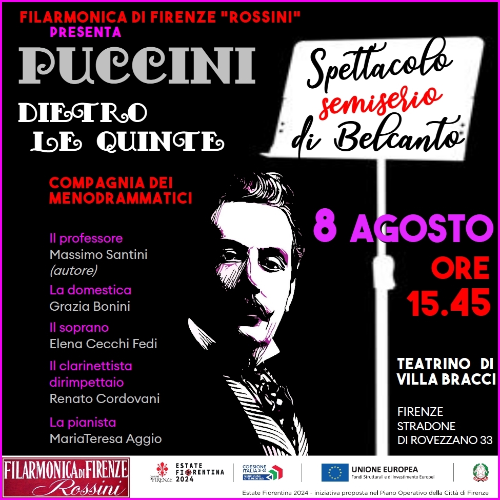 Sulla scena di Villa Bracci un Puccini mai visto, scanzonato toscano da salotto: è il racconto brillante della sua vita artistica intrisa di quotidiano, condito con aneddoti di simpatica irriverenza poco conosciuti al grande pubblico. Come filo conduttore ascoltiamo le arie più amate, cantate dal vivo dalla famosa soprano Elena Cecchi Fedi accompagnata dal pianoforte.
