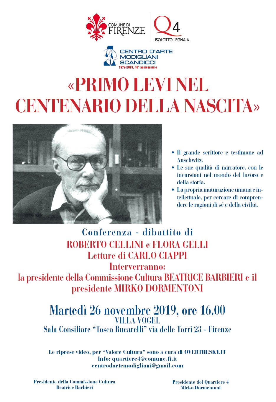 Martedì 26 Novembre alle ore 16 in Sala Consiliare “Tosca Bucarelli” a Villa Vogel, si svolgerà una conferenza-dibattito di Roberto Cellini e Flora Gelli in memoria di Primo Levi, con letture di Carlo Ciappi.