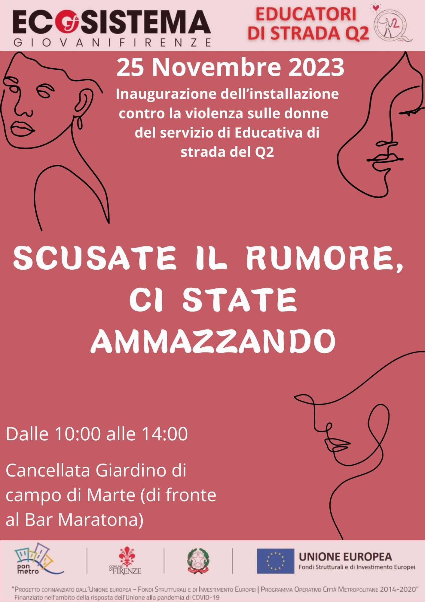Il 25 novembre, dalle ore 10:00 alle ore 14:00, si terrà presso la Cancellata Giardino di Campo di Marte l'inaugurazione dell'installazione contro la violenza sulle donne, promossa dal servizio di Educativa di strada del Q2.
