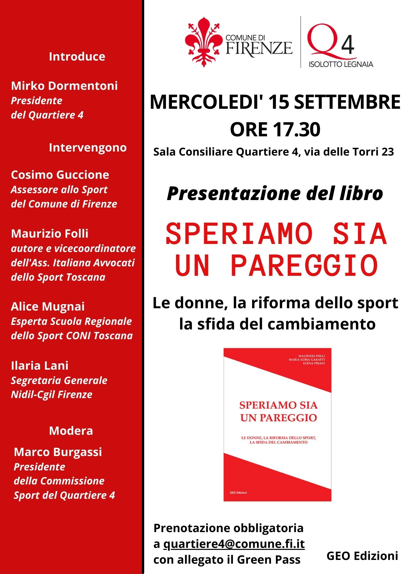 "Speriamo sia un pareggio. Le donne, lo sport e la sfida del cambiamento”. È questo il titolo completo del nuovo libro sulla riforma del diritto sportivo, scritto da Maurizio Folli, in collaborazione con Maria Luisa Garatti e Elena Pisani, per Edizioni La Vela. Nel libro si parla di storia, dalle olimpiadi greche a quelle moderne, ricordando per esempio che Pierre de Coubertin non voleva le donne ai Giochi. Un’altra parte è invece dedicata all’evoluzione della normativa delle pari opportunità nello sport.