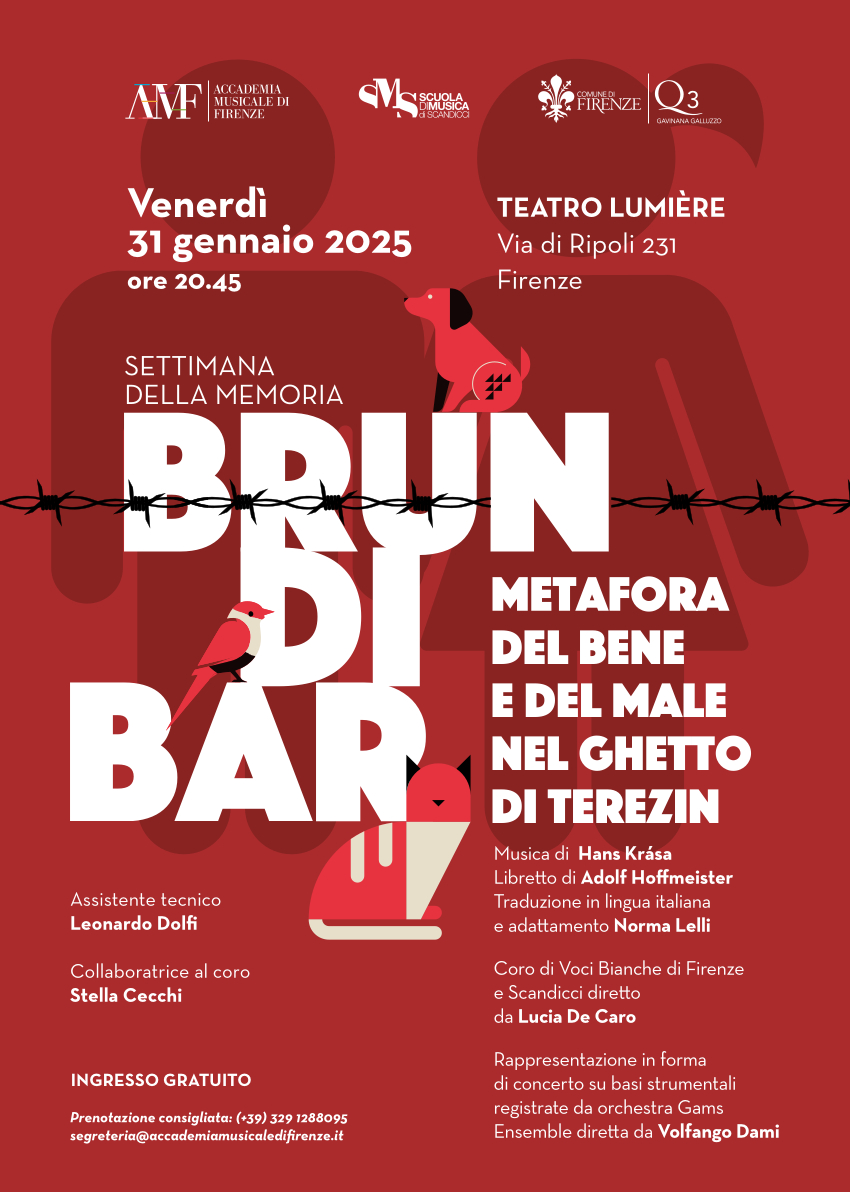 In occasione della Settimana della Memoria, venerdì 31 gennaio 2025 alle ore 20:45 presso il Teatro Lumiere (Via di Ripoli 231, Firenze) si terrà la rappresentazione della composizione musicale "Brundibar, metafora del bene e del male nel campo di concentramento di Terezin" di Hans Krasa a cura dell'Accademia Musicale di Firenze, che vedrà interpreti solisti e Coro di Voci Bianche di Firenze e Scandicci.