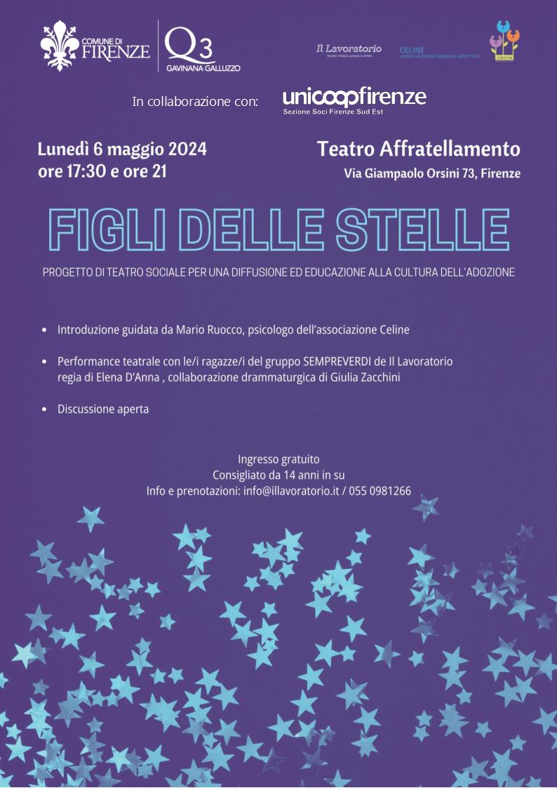 Lunedì 6 maggio 2024 alle ore 17:30 e poi alle ore 21:00 presso il teatro L'Affratellamento (in via Giampaolo Orsini, 73) si terrà il doppio appuntamento teatrale dal titolo “Figli delle stelle”: un progetto di teatro sociale che nasce dalla collaborazione fra l’associazione di famiglie adottive Celine e l’Associazione culturale Il Lavoratorio: lo scopo primario è stato quello di realizzare una performance teatrale per approfondire il tema dell’adozione con un linguaggio scevro da pietismi e pregiudizi e in maniera affettiva, ironica e comunicativa. Il lavoro è nato da una serie di interviste che allievi adolescenti del corso di teatro “Sempreverdi” dell’associazione culturale Il Lavoratorio hanno rivolto a una serie di persone che hanno vissuto sulla loro pelle l’esperienza dell’adozione.
