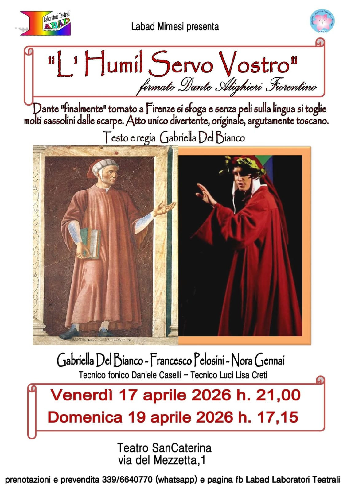 Venerdì 17 alle ore 21.00 e Domenica 20 Aprile alle ore 17.15, presso il Teatro SanCaterina in Via del Mezzetta 1, si terrà lo spettacolo teatrale "L'humil servo vostro - Firmato Dante Alighieri fiorentino", a cura di Labad Mimesi con Francesco Pelosini e Nora Gennai e con testo e regia di Gabriella Del Bianco; un atto unico nel quale il grande poeta, "finalmente" tornato a Firenze, si toglierà, senza peli sulla lingua, molti sassolini dalle scarpe.
