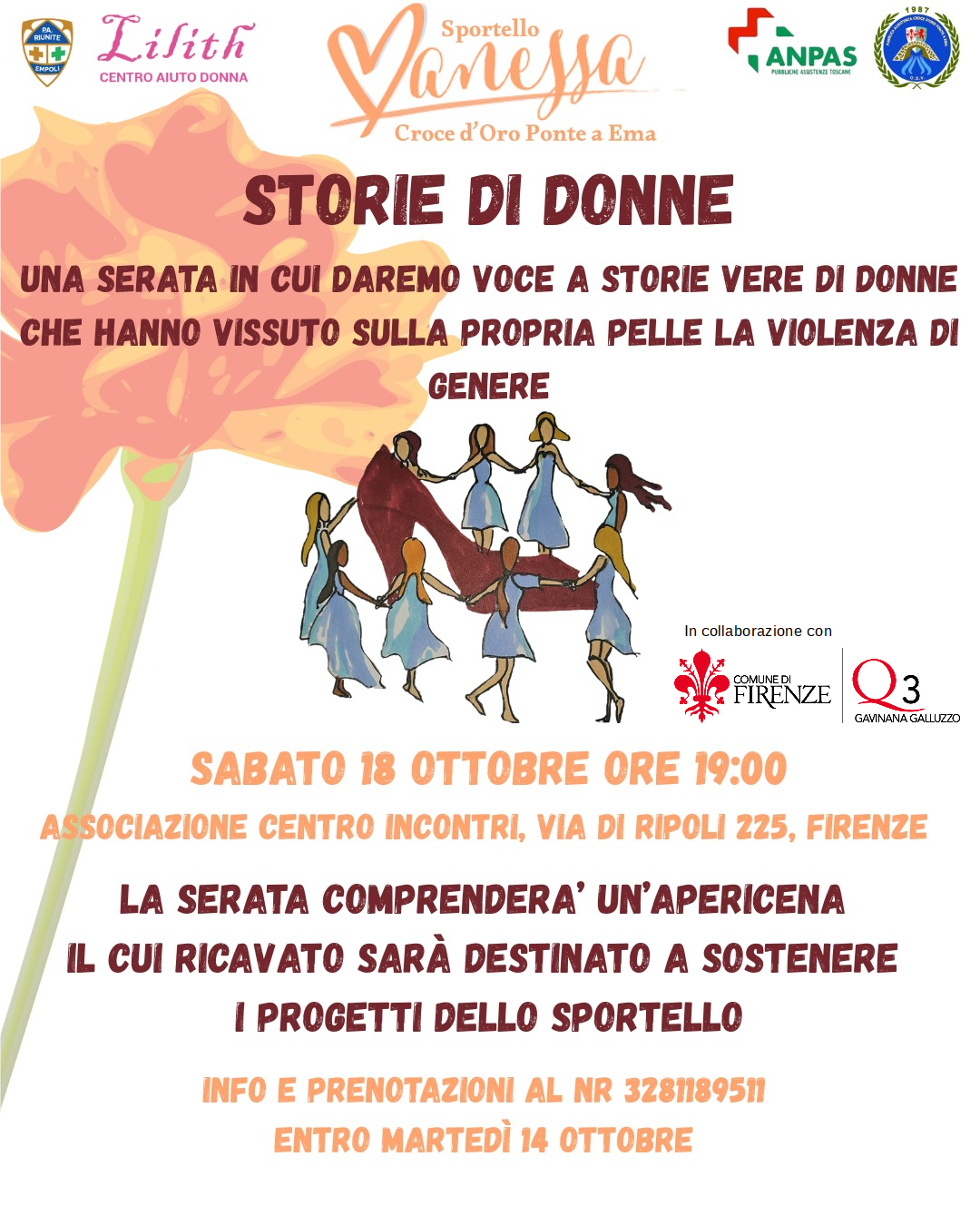 Sabato 18 ottobre 2025 alle ore 19:00 presso l'Associazione Centro Incontri (via di Ripoli, 225, Firenze) si terrà "Storie di donne", una serata nella quale sarà data voce alle donne che hanno vissuto sulla propria pelle la violenza di genere.
