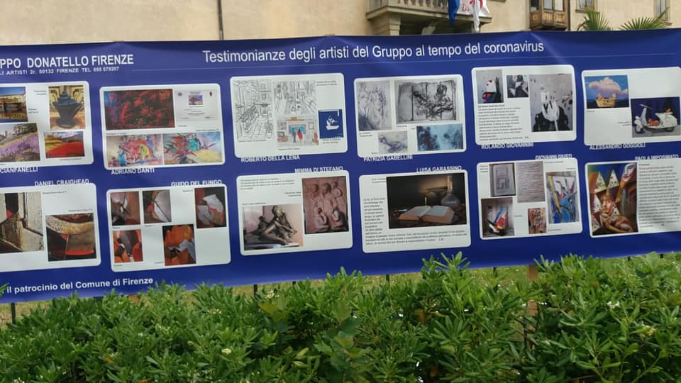Con le riproduzioni di lavori, foto e riflessioni dei mesi passati, in forzato isolamento, hanno realizzato quattro grandi stendardi orizzontali, per una lunghezza complessiva di quasi 20 metri, dal titolo “Testimonianze degli artisti del Gruppo Donatello al tempo del Coronavirus” e sono stati posti nel giardino di Villa Arrivabene, sede del Quartiere 2.