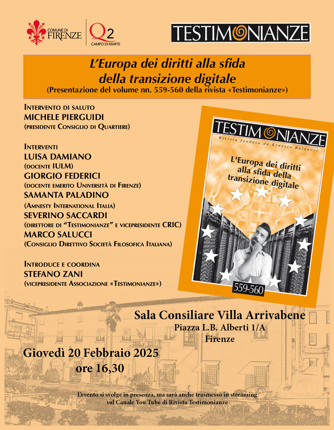 Giovedì 20 Febbraio alle ore 16.30, nella Sala Consiliare in Villa Arrivabene, si terrà la presentazione del volume nn. 559-560 della rivista "Testimonianze", dal titolo "L'Europa dei diritti della sfida della transizione digitale"; alla presentazione interverranno Luisa Damiano, docente IULM, Giorgio Federici, docente emerito dell'Università di Firenze, Samanta Paladino, Amnesty International Italia, Severino Saccardi, direttore di "Testimonianze" e Vicepresidente CRIC e Marco Salucci, Consiglio Direttivo Società Filosofica Italiana, con il coordinamento di Stefano Zani, Vicepresidente dell'Associazione Testimonianze.