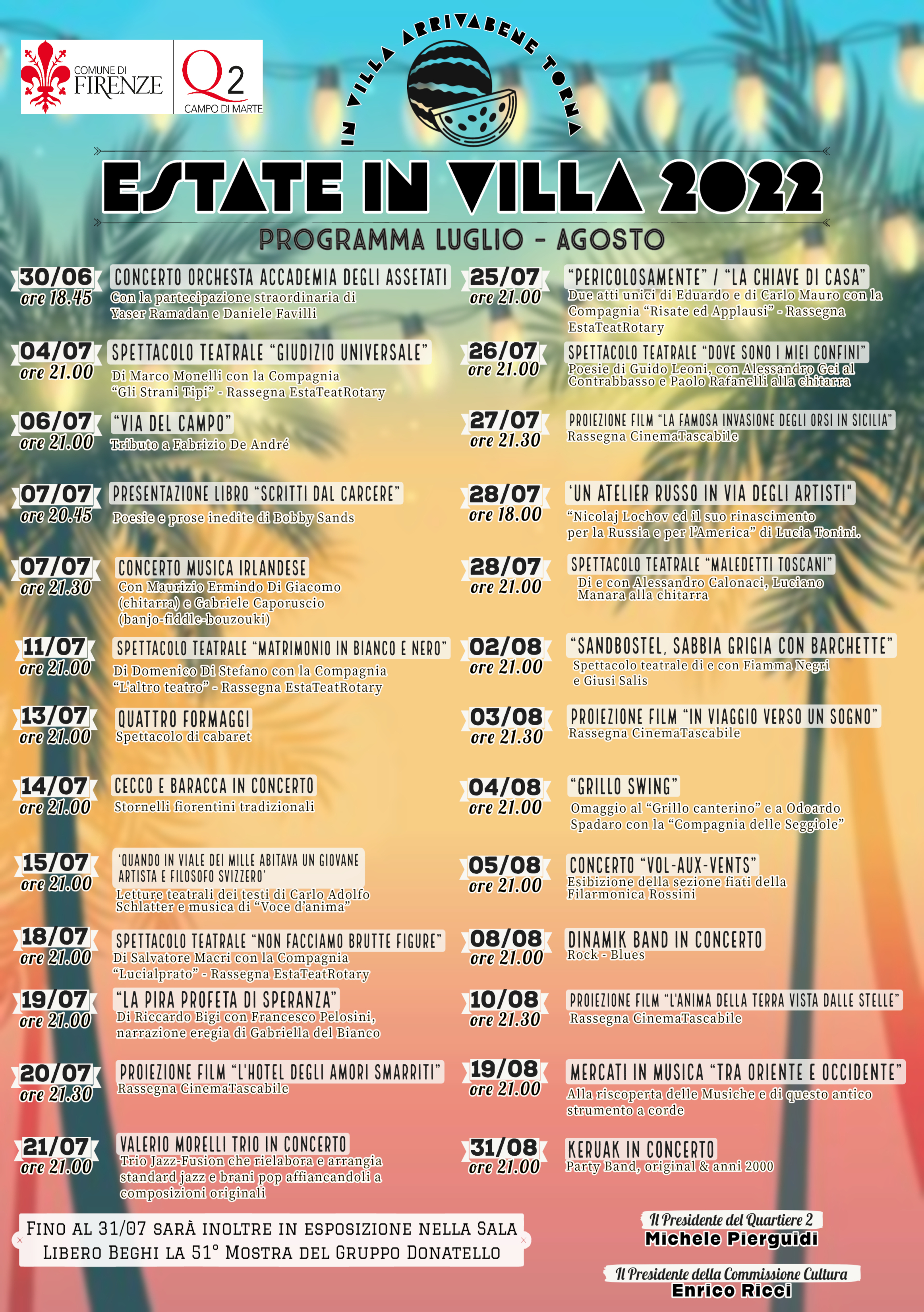 Torna anche quest'anno la rassegna di spettacoli, concerti, proiezioni, letture e conferenze nel giardino di Villa Arrivabene, in un calendario ricco di eventi ad ingresso libero e gratuito. Il calendario della prima parte della rassegna, dal 30 Giugno al 31 Agosto, è disponibile anche in formato pdf.