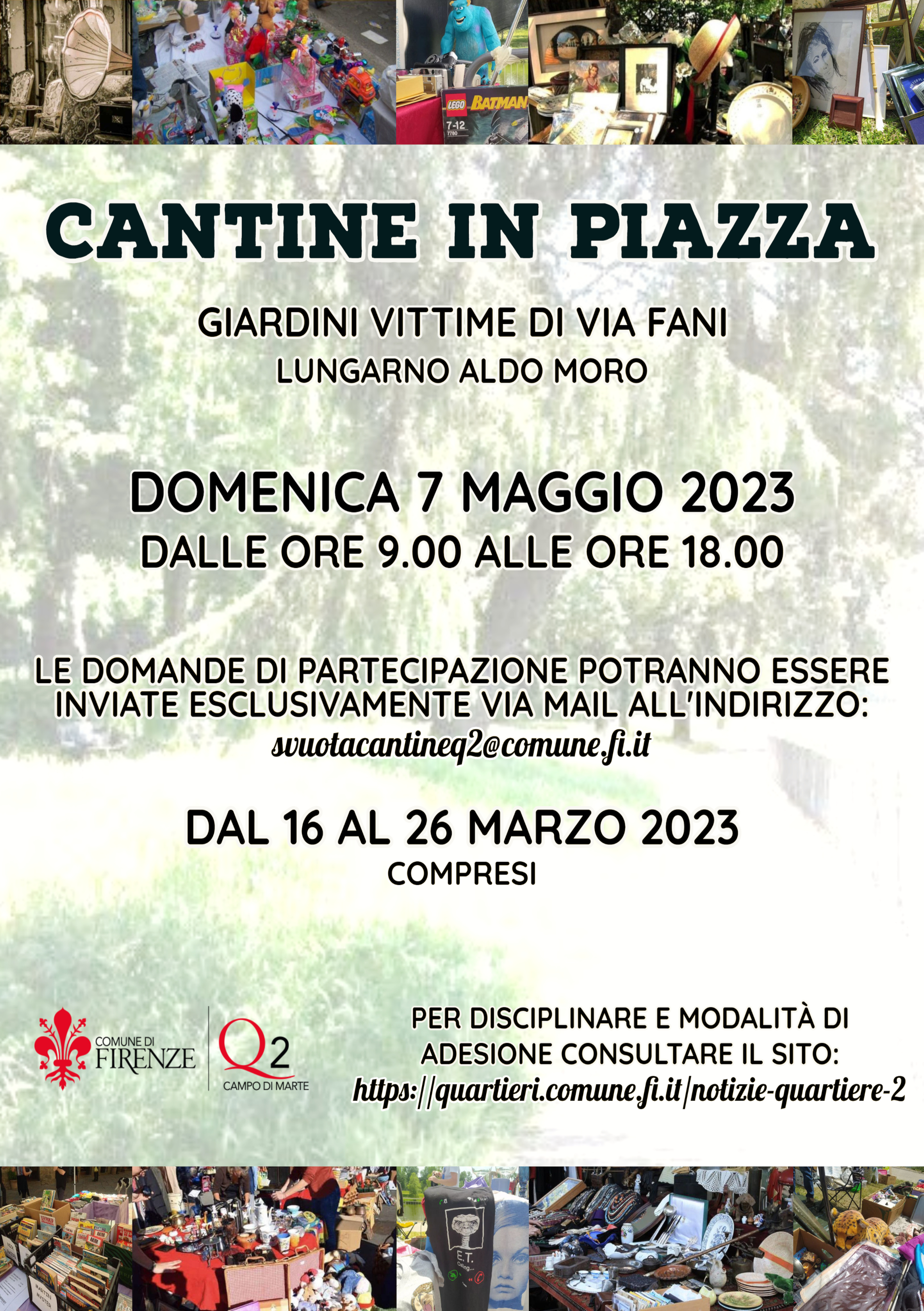 Si rinnova l'appuntamento delle Cantine in Piazza al Quartiere 2, con l'edizione primaverile dell'iniziativa il cui obiettivo è non gettare ciò che può essere ancora riutilizzato. Domenica 7 Maggio, ai Giardini Vittime di Via Fani (L.no Aldo Moro) dalle ore 9.00 alle ore 18.00, il Quartiere 2 riproporrà il tradizionale mercatino di quartiere dove ad essere protagonisti saranno i cittadini.