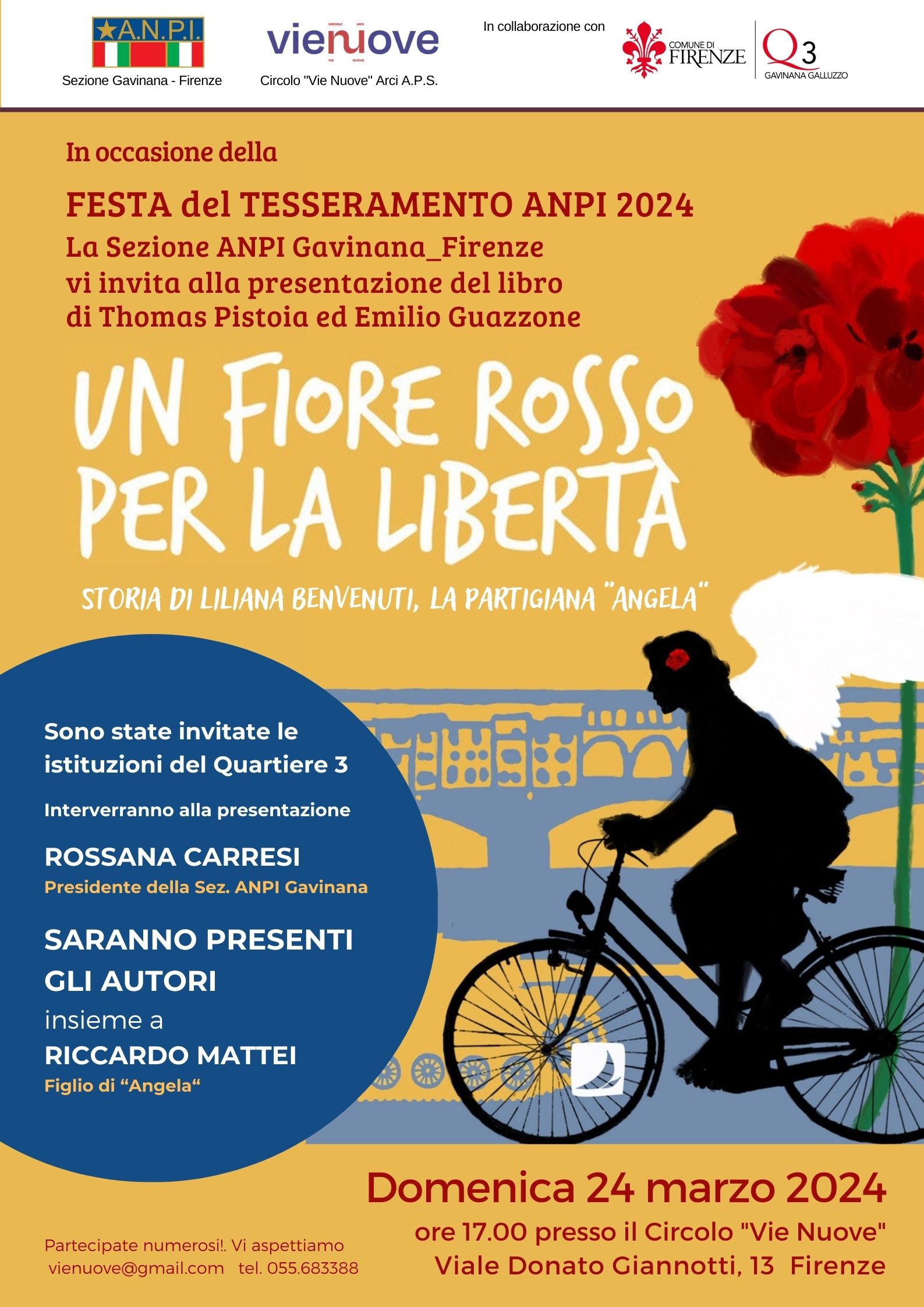 Domenica 24 marzo 2024 alle ore 17 presso il Circolo "Vie Nuove" (viale Donato Giannotti, 13 - Firenze), in occasione della festa del tesseramento ANPI 2024, si terrà la presentazione del libro di Thomas Pistoia ed Emilio Guazzone dal titolo "Un fiore rosso per la libertà - Storia di Liliana Benvenuti, la partigiana 'Angela' ".