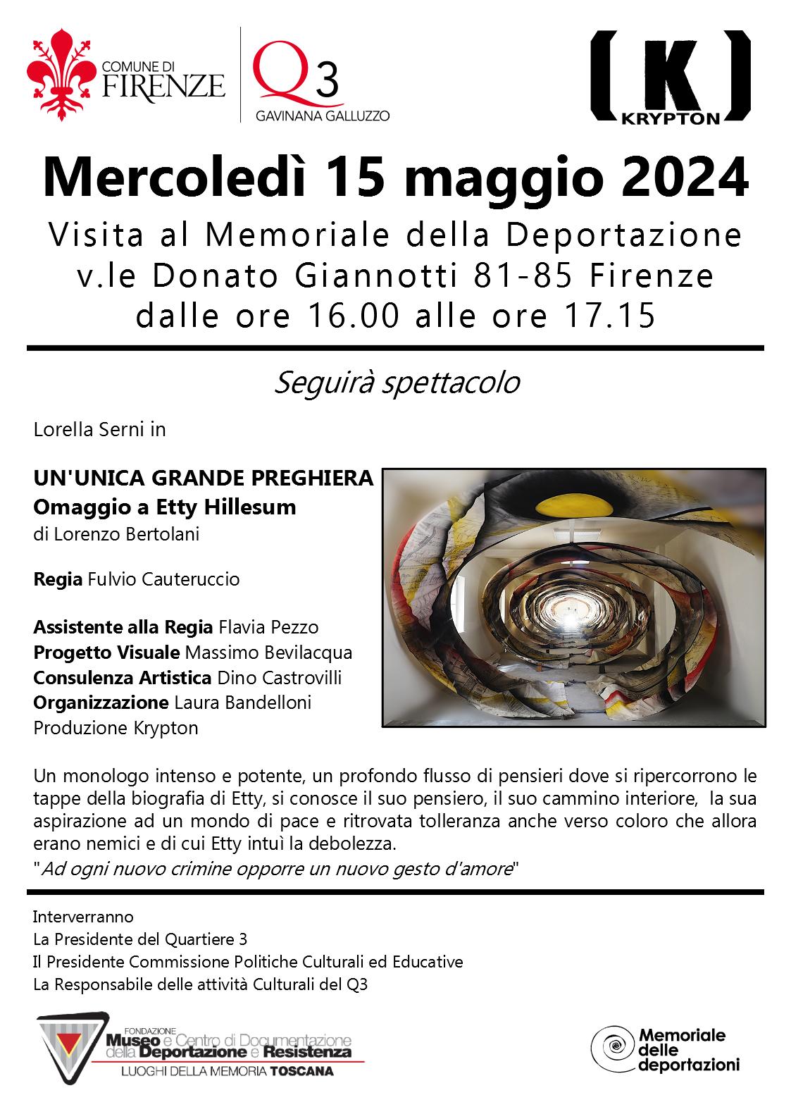 Mercoledì 15 maggio 2024 dalle ore 16 alle ore 17.15 si svolgerà una visita al Memoriale della Deportazione (v.le Donato Giannotti, 81-85 Firenze) alla quale seguirà lo spettacolo dal titolo "Un'unica grande preghiera" un omaggio a Etty Hillesum di Lorenzo Bertolani con la regia Fulvio Cauteruccio (produzione Krypton): un monologo intenso e potente, un profondo flusso di pensieri dove si ripercorrono le tappe della biografia di Etty, si conosce il suo pensiero, il suo cammino interiore, la sua aspirazione ad un mondo di pace e ritrovata tolleranza anche verso coloro che allora erano nemici e di cui Etty intuì la debolezza.