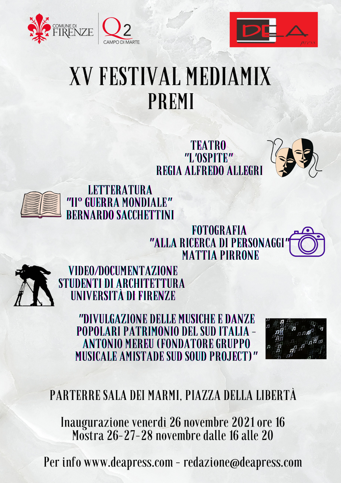 Il 26 Novembre 2021 dalle ore 16,00 in poi presso il Parterre in Piazza della Liberta alla Sala dei Marmi premiazione dei vincitori di questo evento Mediamix. curato dal Centro Studi DEAonlus in collaborazione con il Comune di Firenze e l’Università degli Studi, Dipartimento di Architettura – DIDA - Laboratorio Video per il Designer e l’Architettura dei Proff Scalzo e Di Cintio.