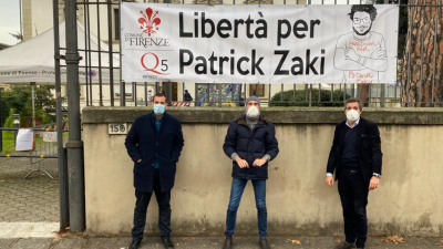 Uno striscione appeso alla recinzione della sede di Villa Pallini per esprimere solidarietà a Patrick Zaki